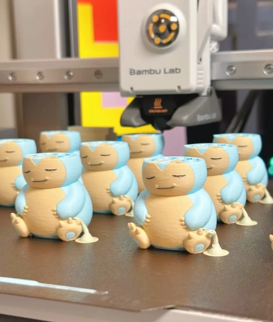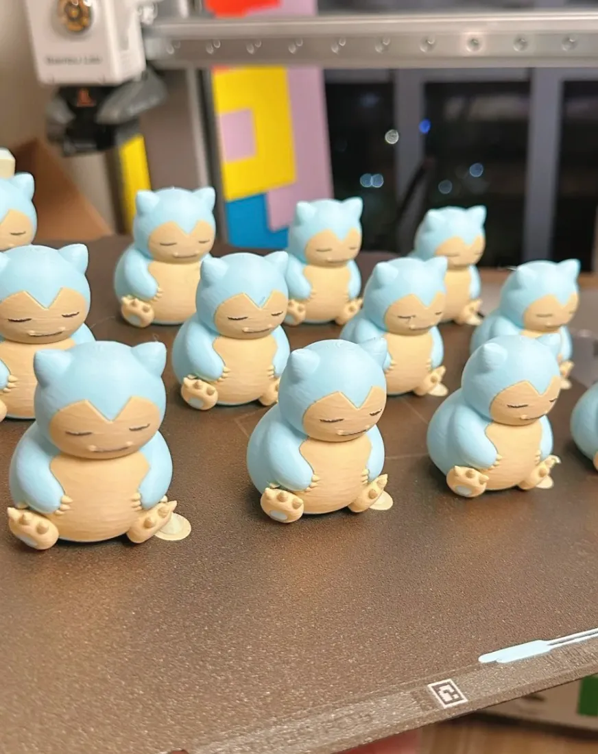 Several small character figurines with ice blue upper body and beige base sitting on 3D printer build plate