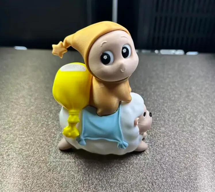 Close-up of small 3D printed character figurines showing smooth ice blue surface and refined layer texture