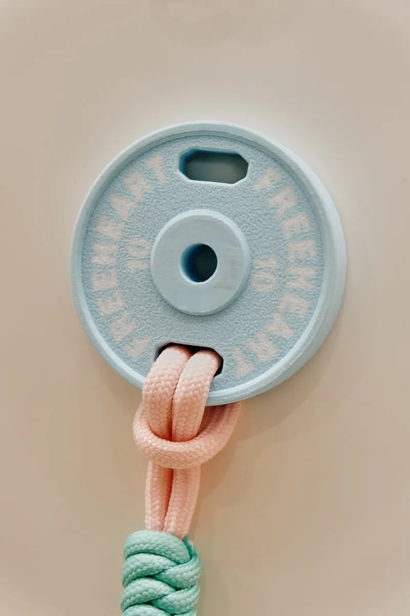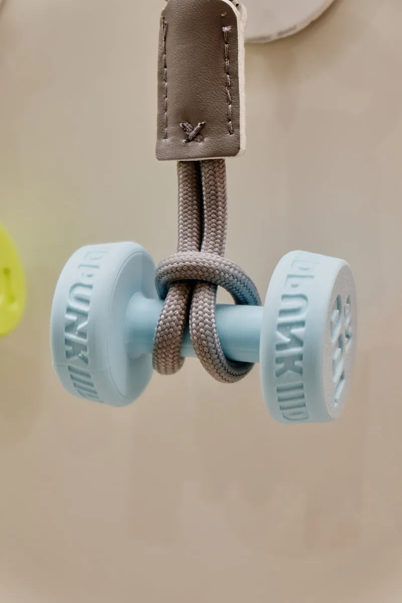Light ice blue 3D printed dumbbell-shaped hook mounted with rope and leather strap