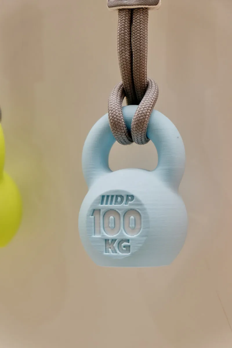 Ice blue kettlebell-shaped 3D printed hook with embossed “100 KG” detail attached to rope