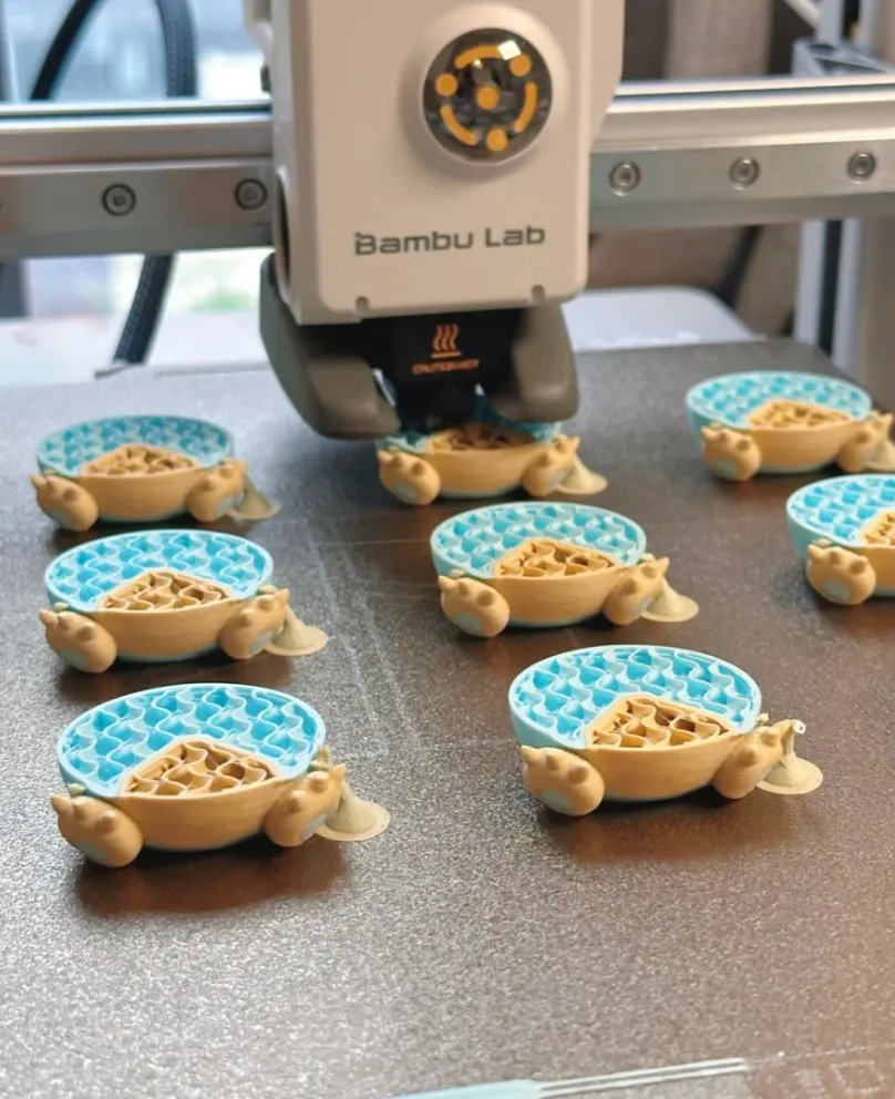 3D printer producing small turtle models with ice blue shell tops and beige bodies on build plate