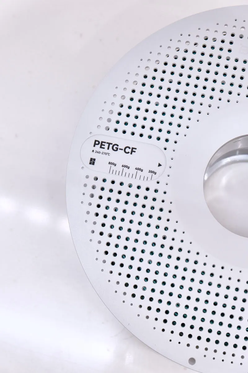 Bambu PETG-CF significantly improves the stiffness of regular PETG while enhancing both strength and toughness, making it an all-rounder in mechanical performance among basic filaments. It is well suited for functional and load-bearing parts. The optimized formulation also greatly reduces clumping and stringing compared to standard PETG, while delivering a signature carbon fiber texture with a glossier finish than Bambu PLA-CF.