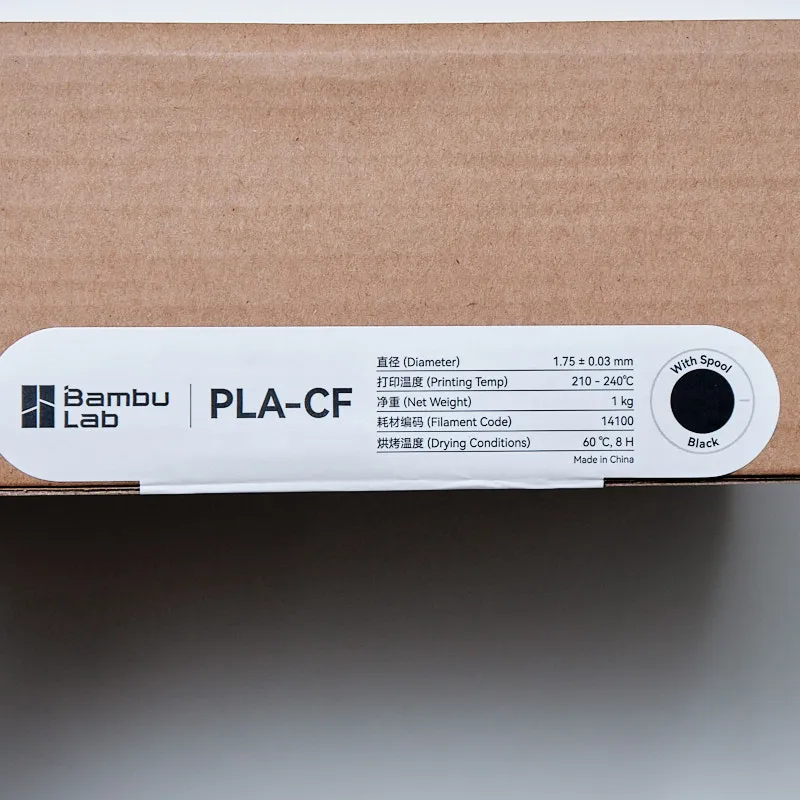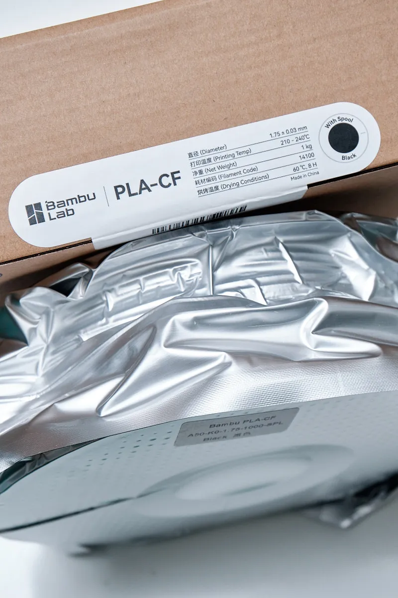 Bambu PLA-CF comes with a basic reusable spool, designed for convenient storage and multiple print sessions.