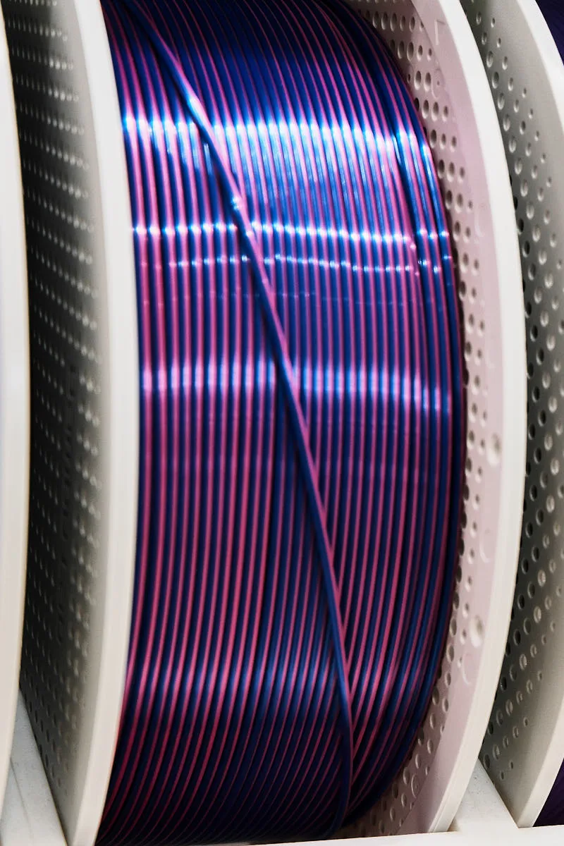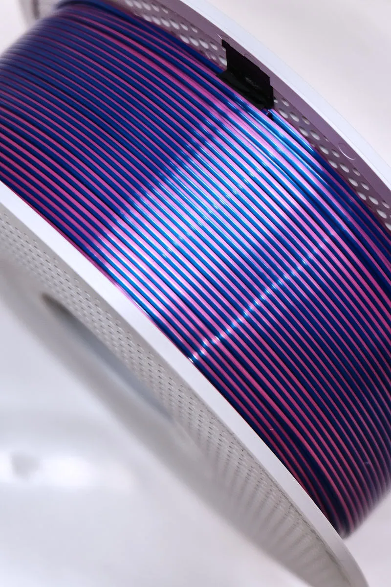 By merging electric blue and bright pink silk tones into a single filament strand, PLA Silk Neon City reveals dynamic color changes as the printed object is rotated or viewed from different angles.