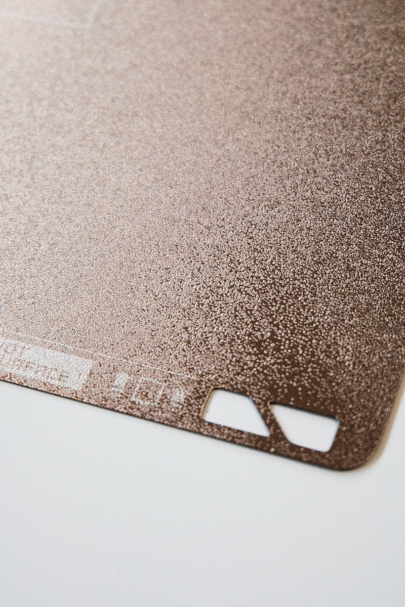 The textured PEI surface is created using a powder-coating process, resulting in a durable, rugged finish. This texture produces a unique first-layer appearance while maintaining consistent adhesion across the build area.
