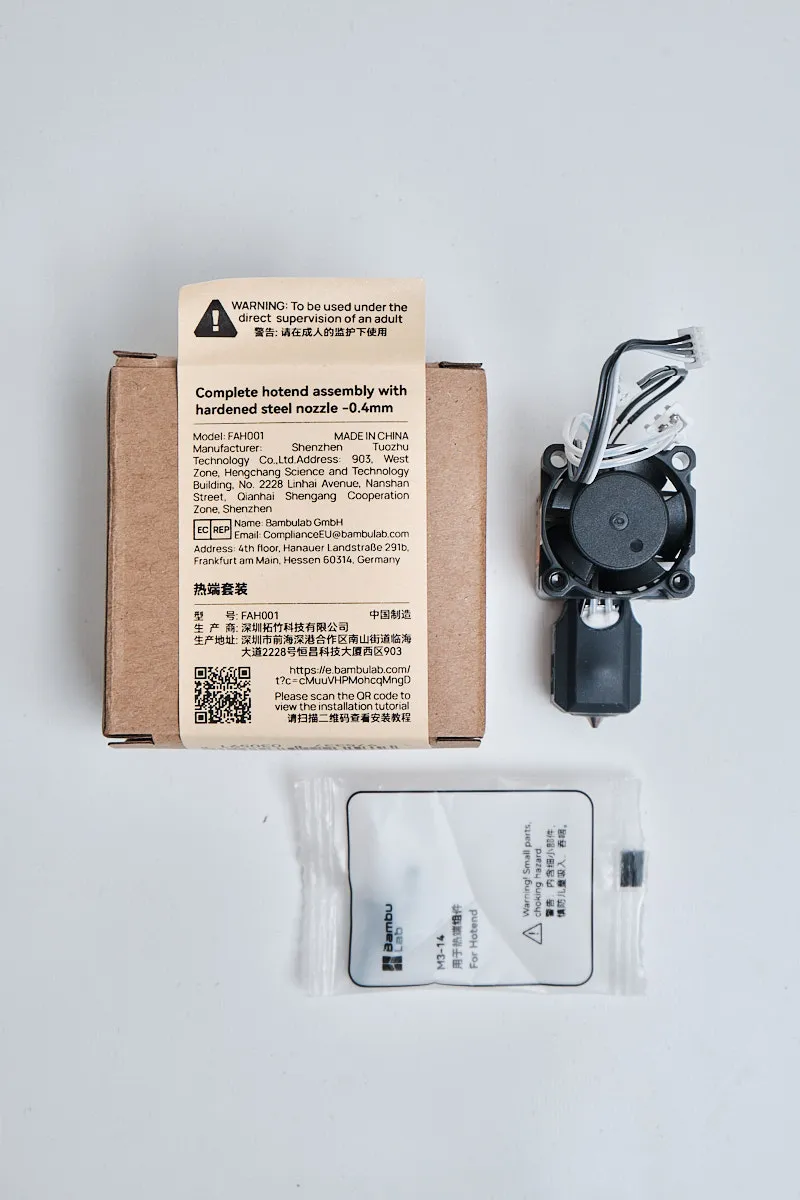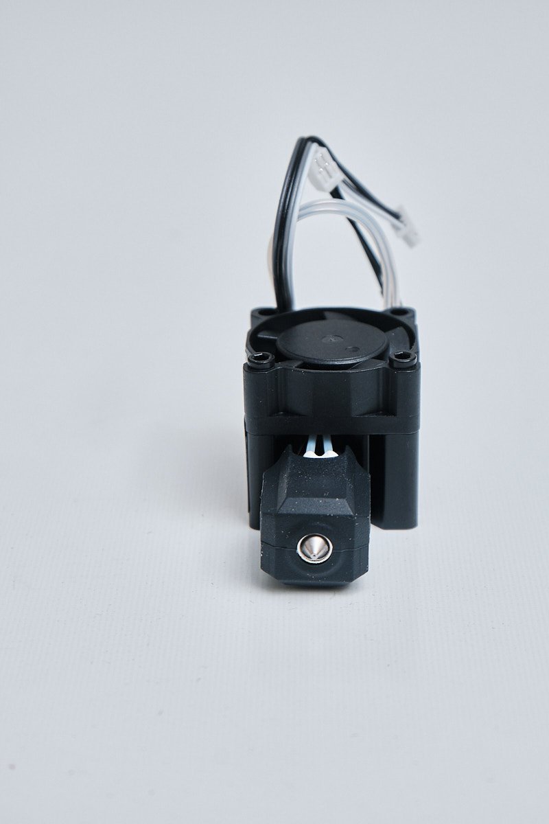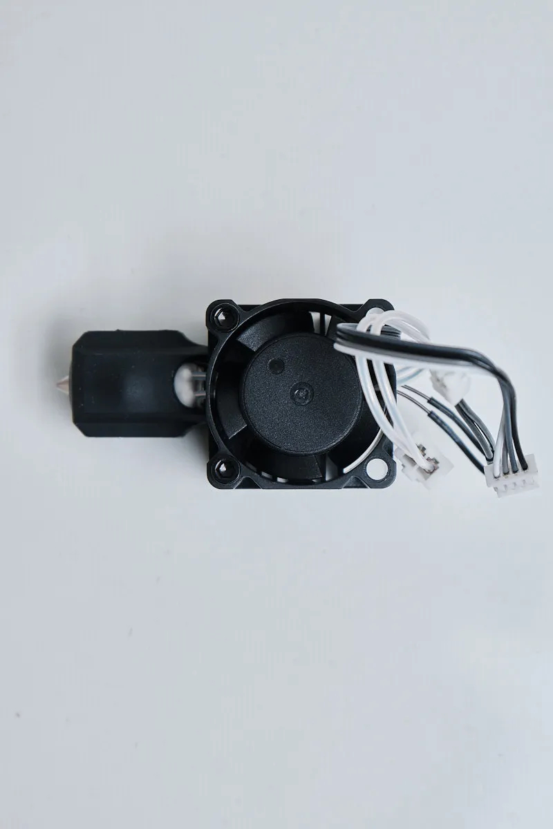 - Includes hotend with 0.4mm hardened steel nozzle, heater, thermistor, and cooling fan