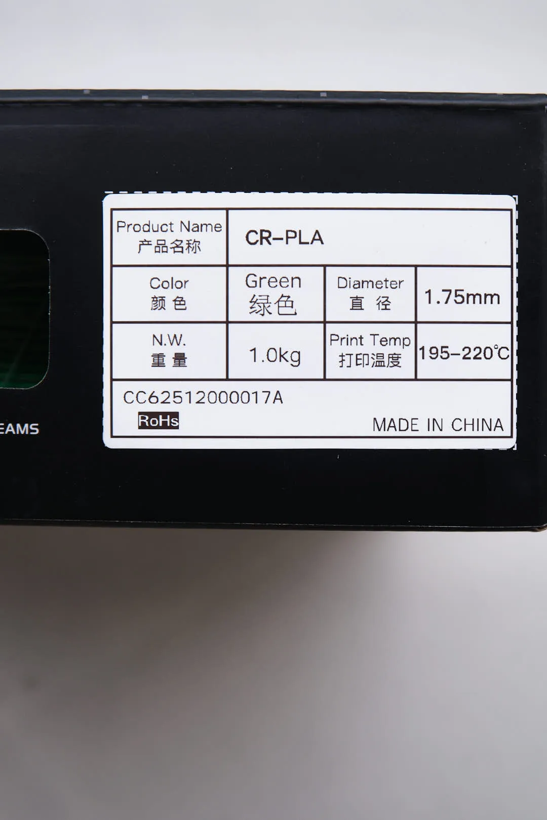 | PRODUCT NAME CR-PLA Carbon 3D Printer Filament | DIAMETER 1.75 ± 0.03 mm | DENSITY 1.25 g/cm³ |