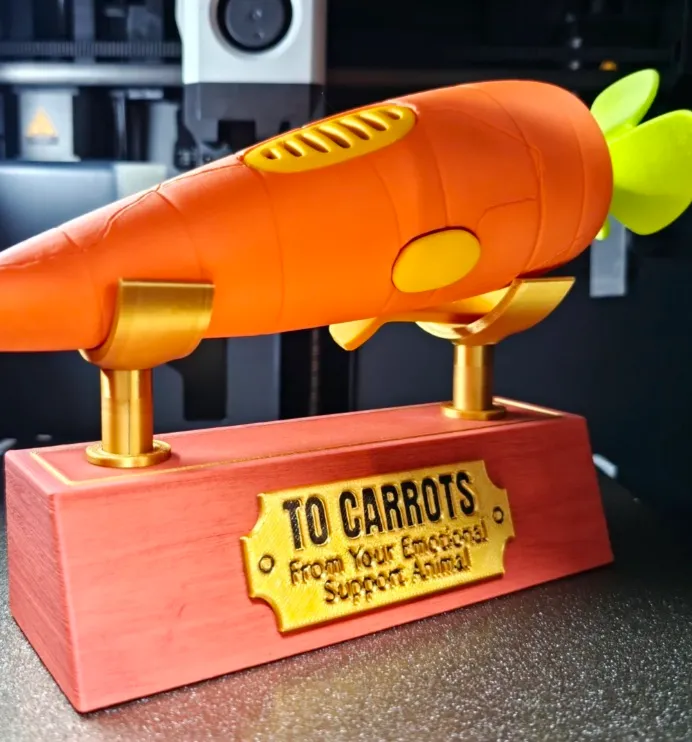 Carrot-shaped 3D printed trophy mounted on a wooden-style base with metallic plaque